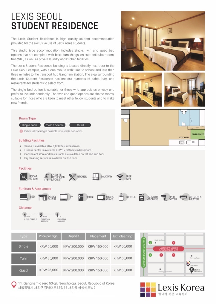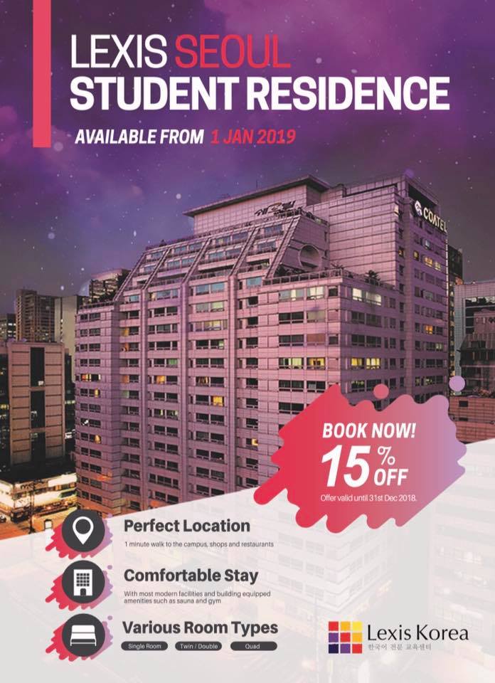 Lexis Korea語言學校在2019年一月即將開放新的學生宿舍,位於超級高級區-江南站,有單人房、雙人房、三人房可供選擇。不論是地點或是宿舍環境都無話可說!12/31前透過CourseApp完成預訂即可享有85折優惠唷!
